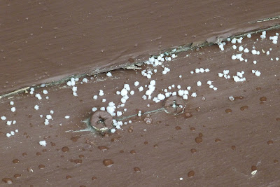 That photo is on the steps to the porch at Stratford Point early that afternoon. The drops that you can see are the white things that have melted, and I want to know what that white stuff is. You can see the tops of the screws on the step that help to provide a sense of relative size. See what you can come up with! It is not as easy as it looks.