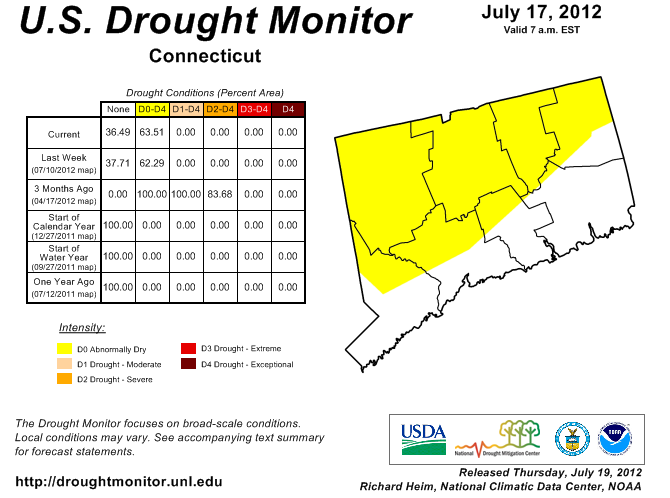 These graphics, courtesy of the U.S. drought monitor, show Connecticut with only minimal "very dry" conditions across about 63.5% of the state while the remaining approximately 36.5% of our lands along the coast are normal.